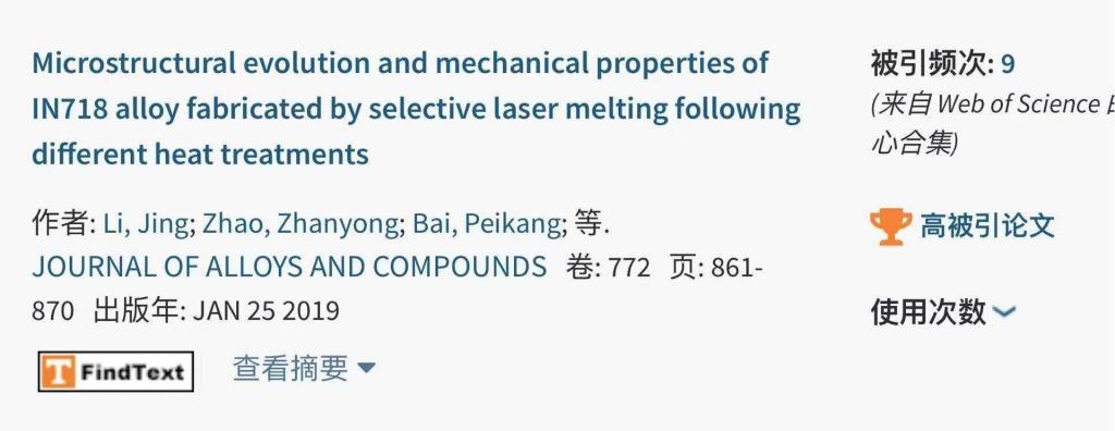 论文题目:Microstructural evolution and mechanical properties of IN718 alloy fabricated by selective laser melting following different heat treatments。